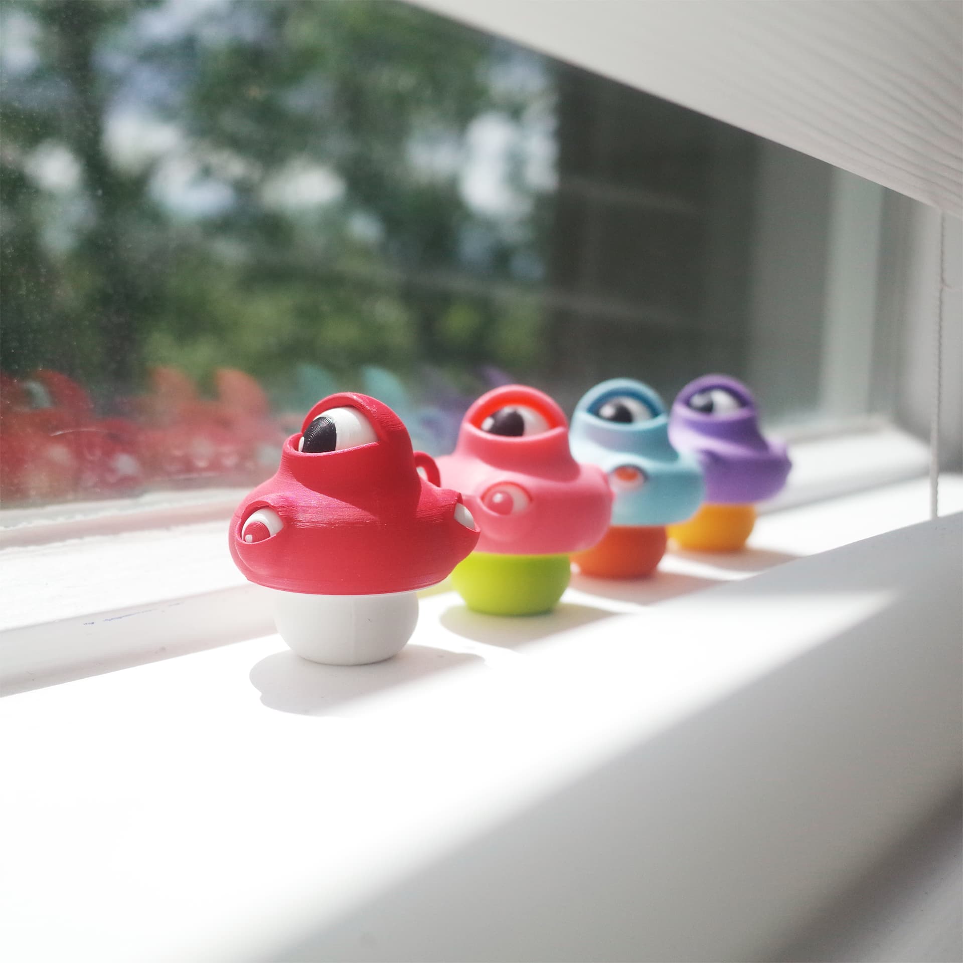 Inspired by my obsession for mushrooms and some random electic pulses in the brain, I came across this odd idea. The fun comes from its odd eyes. You can turn them and you will see a different coloured pupil. The spooky little thing is not just a mushroom anymore, it will become your tiny little go-to guardian that stares your enemies away.